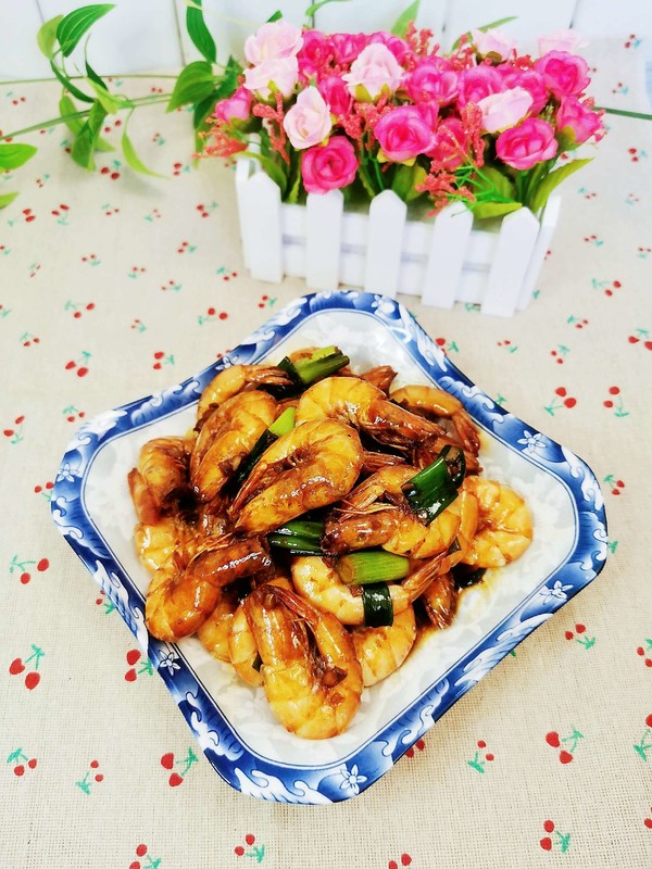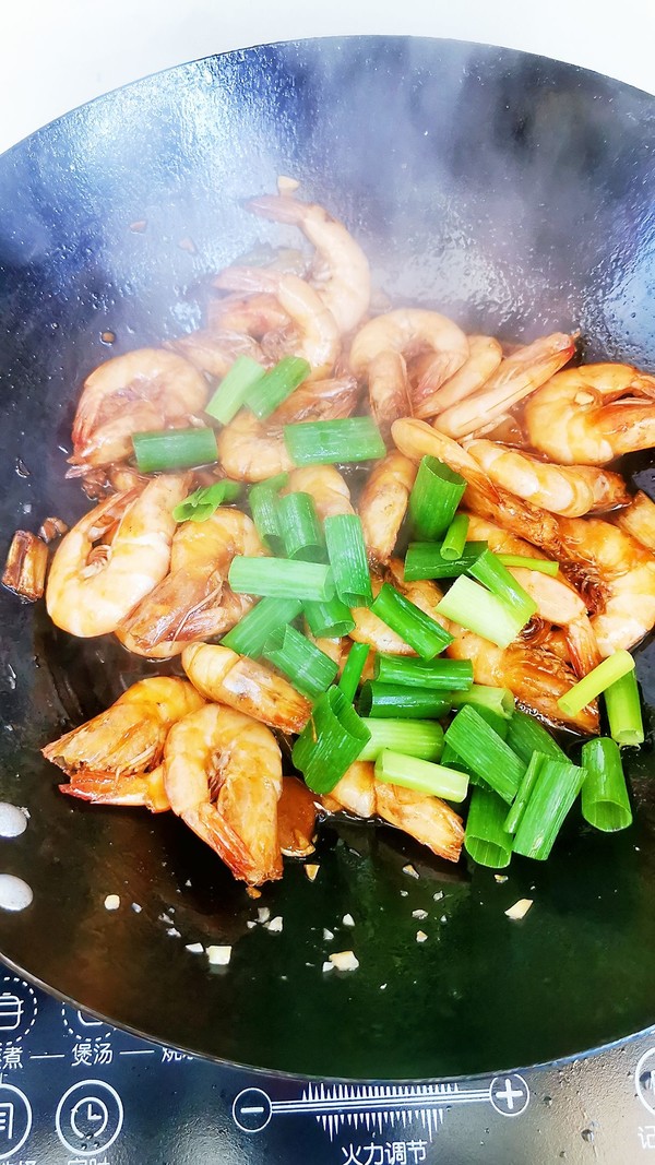 蝦的炒制時(shí)間無需太長,很容易熟,老抽和鹽注意用量,否則會(huì)咸,喜歡吃辣的,可以再放點(diǎn)干辣椒什么的